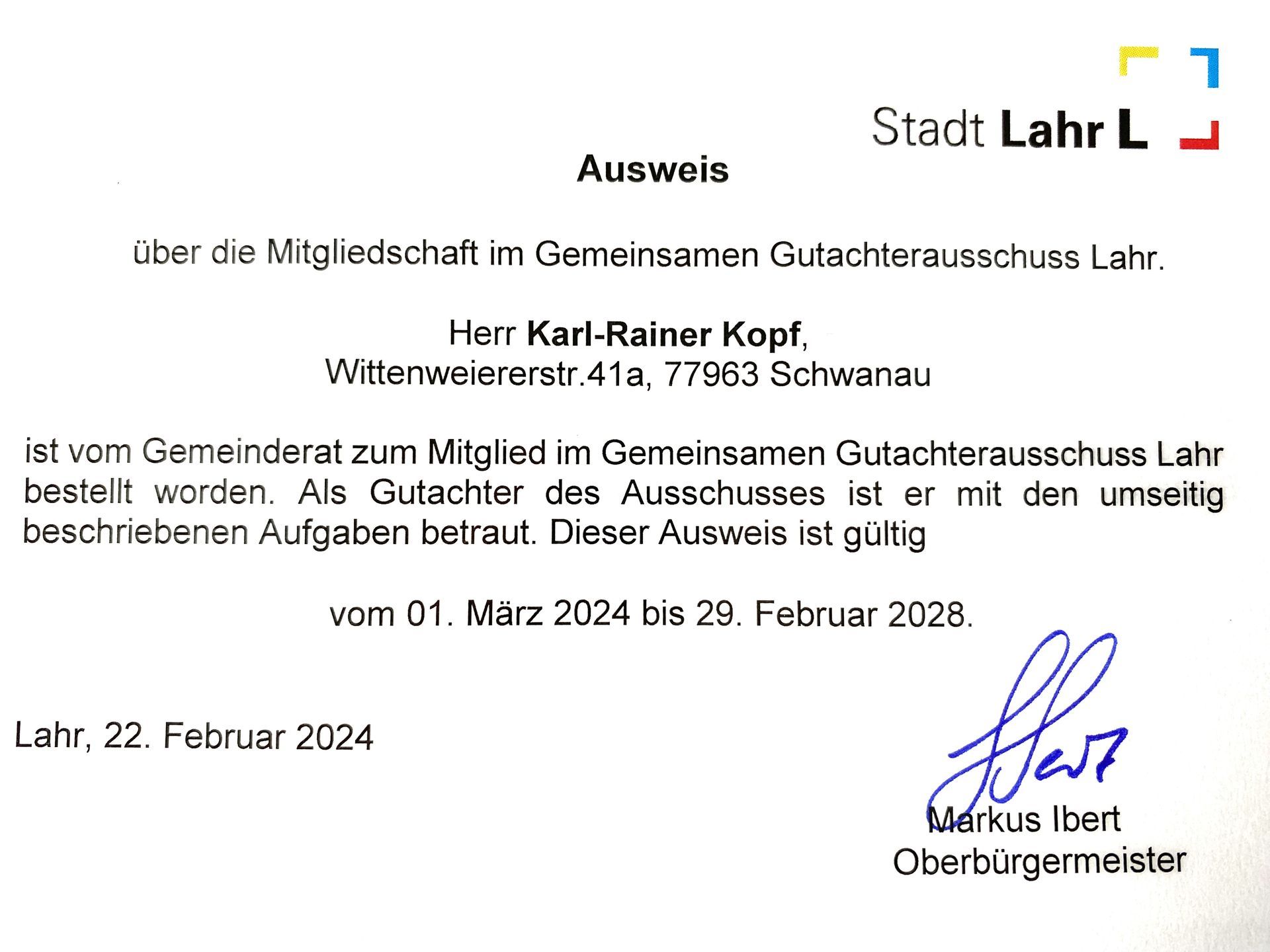 ehrenamtlicher Gutachter der Stadt Lahr.